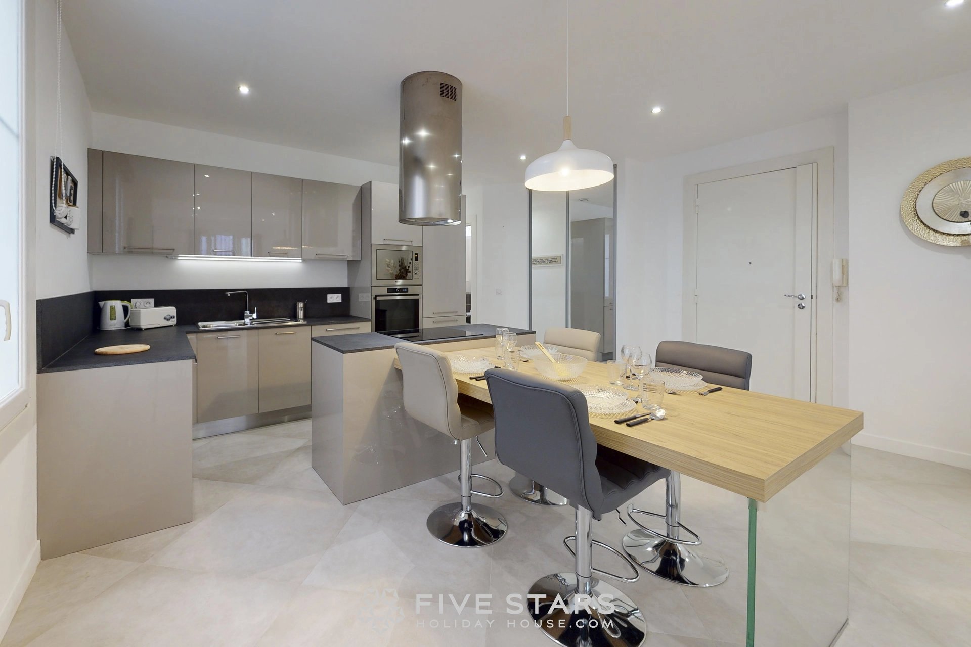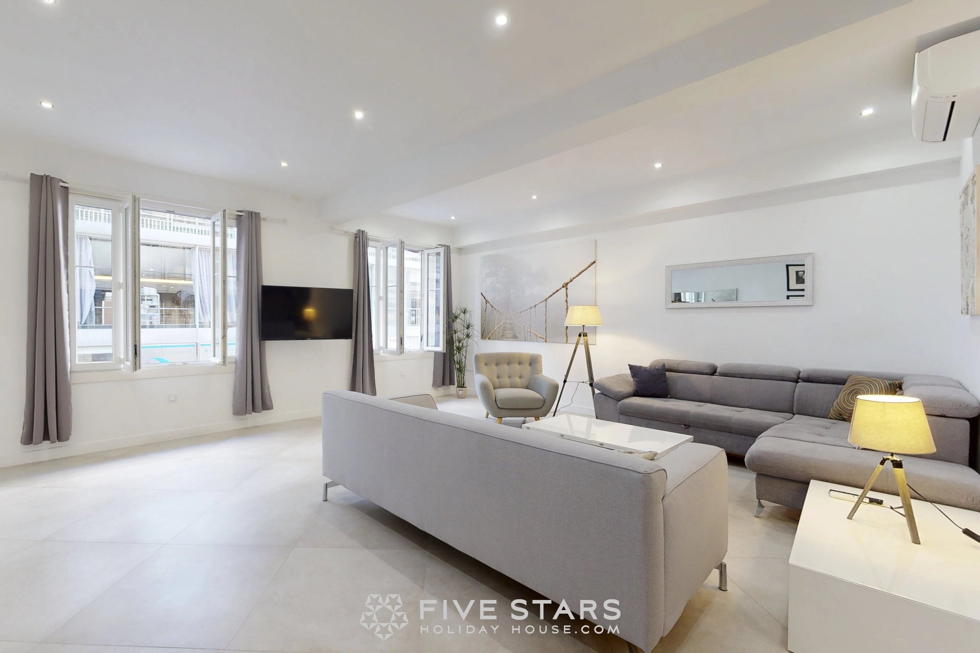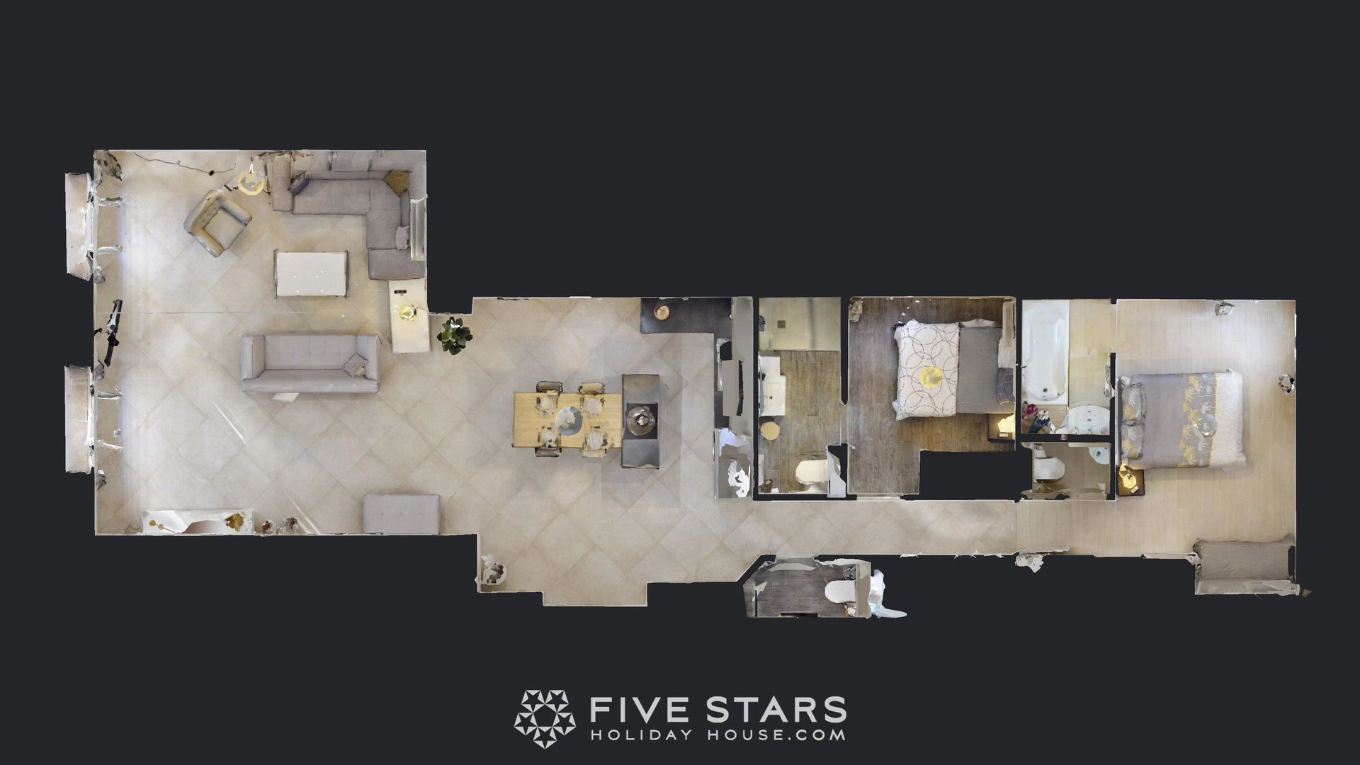 Il est composé d'un séjour avec cuisine américaine équipée, de deux chambres dont une avec salle d'eau toilette et l'autre salle de bains toilette, ainsi que d'une toilette privative.